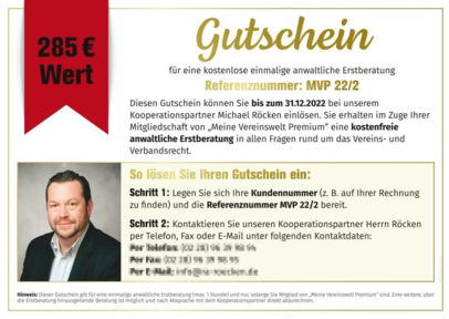 Ja, Sie haben richtig gelesen! Sie erhalten als Mitglied von Meine Vereinswelt Premium nicht nur einen, sondern sogar zwei Beratungsgutscheine pro Jahr. Deshalb zögern Sie nicht länger und sagen Sie „Ja“: