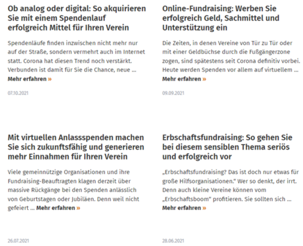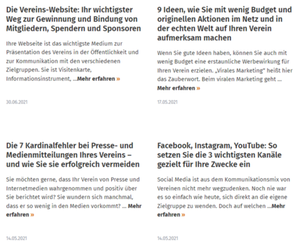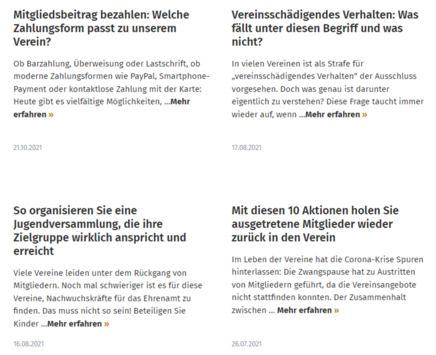 Zu jeder Expertin und zu jedem Experten wird genau beschrieben, welche Schwerpunkte er oder sie im Vereinsrecht, beim Thema Verein & Finanzen, Gemeinnützigkeit, Steuern, Vereinsorganisation, Social Media oder auch PR- und Öffentlichkeitsarbeit hat. Sie können sich damit für Ihre ganz spezielle Frage punktgenau Ihre Wunschexpertin oder Ihren Wunschexperten aussuchen. Können ihn oder sie direkt anmailen – und bekommen umgehend Ihre Antwort.