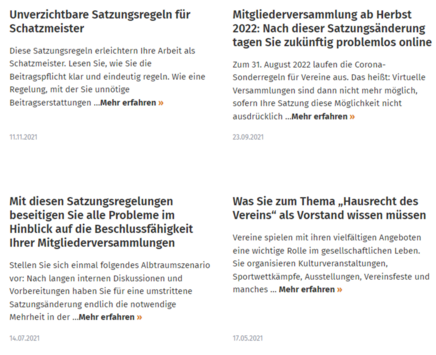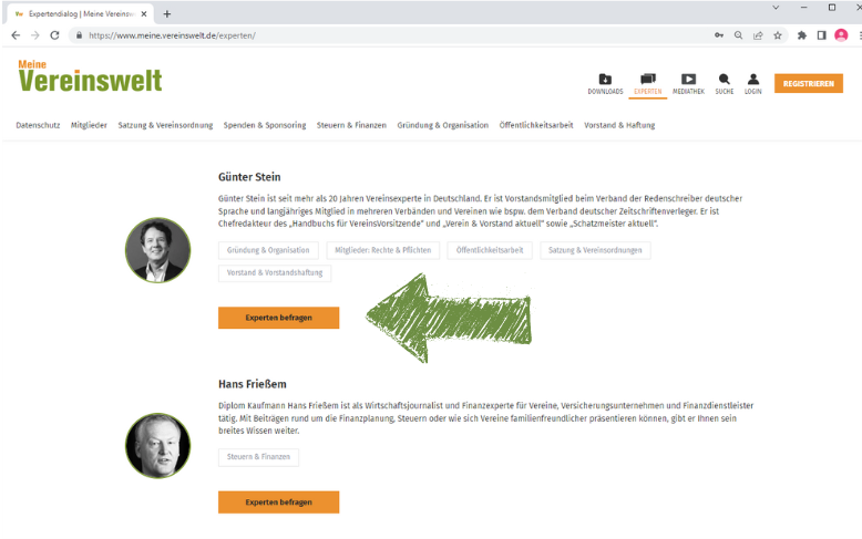 Zu jeder Expertin und zu jedem Experten wird genau beschrieben, welche Schwerpunkte er oder sie im Vereinsrecht, beim Thema Verein & Finanzen, Gemeinnützigkeit, Steuern, Vereinsorganisation, Social Media oder auch PR- und Öffentlichkeitsarbeit hat. Sie können sich damit für Ihre ganz spezielle Frage punktgenau Ihre Wunschexpertin oder Ihren Wunschexperten aussuchen. Können ihn oder sie direkt anmailen – und bekommen umgehend Ihre Antwort.
